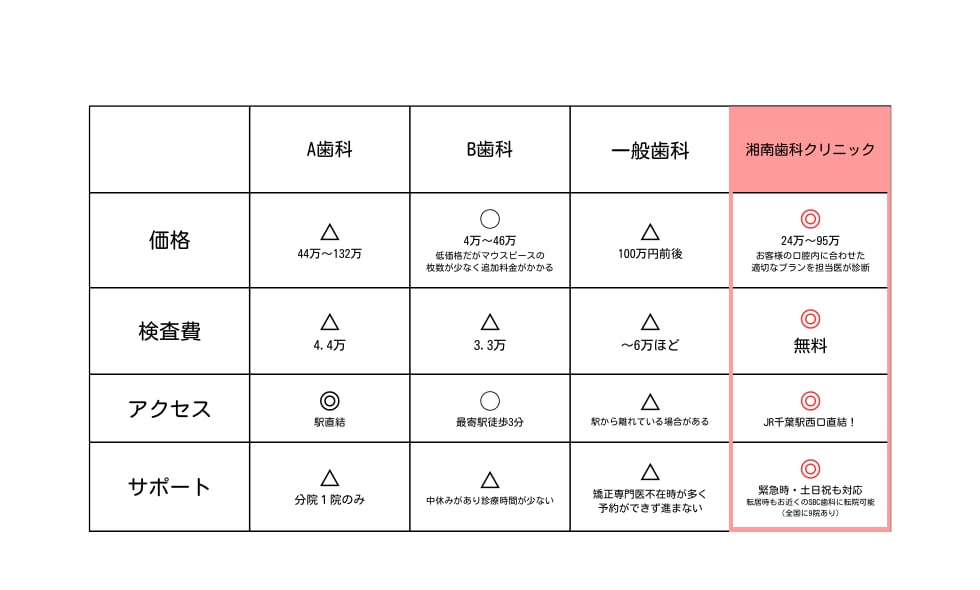 下の表では千葉駅近郊のとある矯正歯科、保険診療も行うような一般歯科と「湘南歯科クリニック(SBC)」を比較したものです。