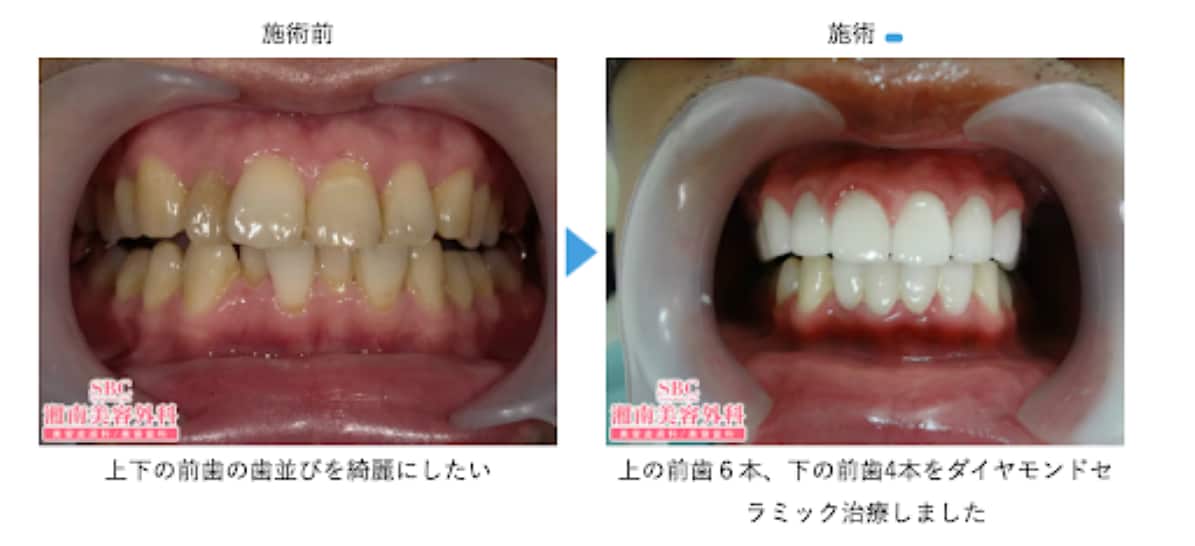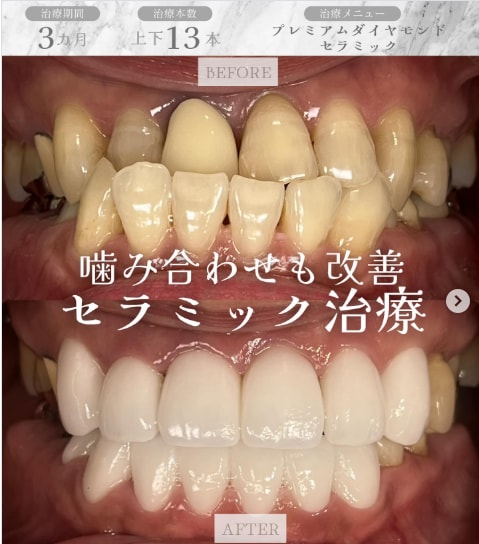 プレミアムダイヤモンドセラミックの症例です。上下13本をわずか3ヶ月で整え、お口全体の印象を劇的に改善しました。