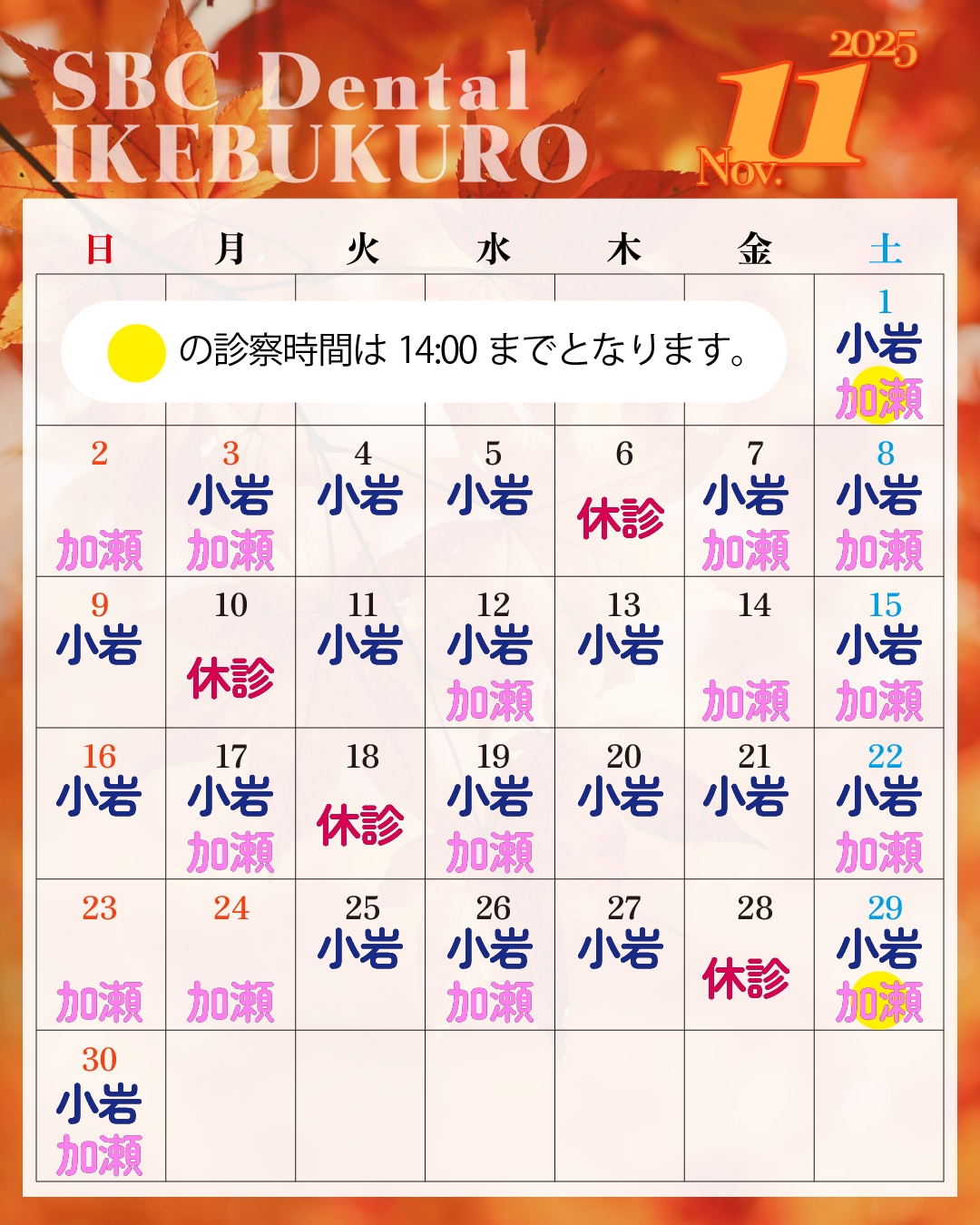 11月の休診日・医師の出勤日をお知らせいたします。