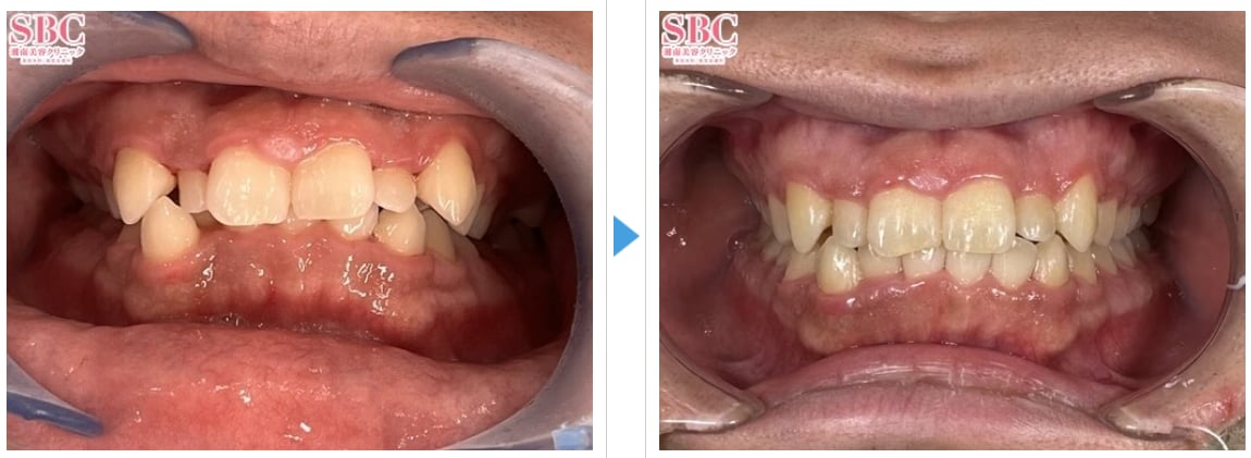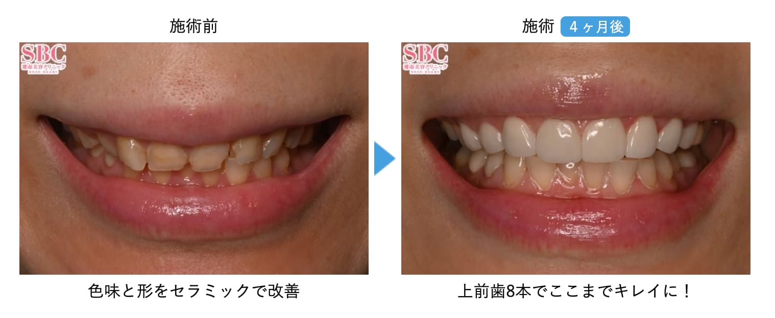 セラミック治療は、歯の形や角度、噛み合わせのバランスを被せ物によって整え、口元の印象の改善を目指す治療法です。過蓋咬合のように前歯の噛み合わせが深いケースでも、歯の長さや位置関係を調整することで印象の変化が期待できます。ここでは実際にセラミック治療を行った症例写真とともに、治療内容をご紹介します。
