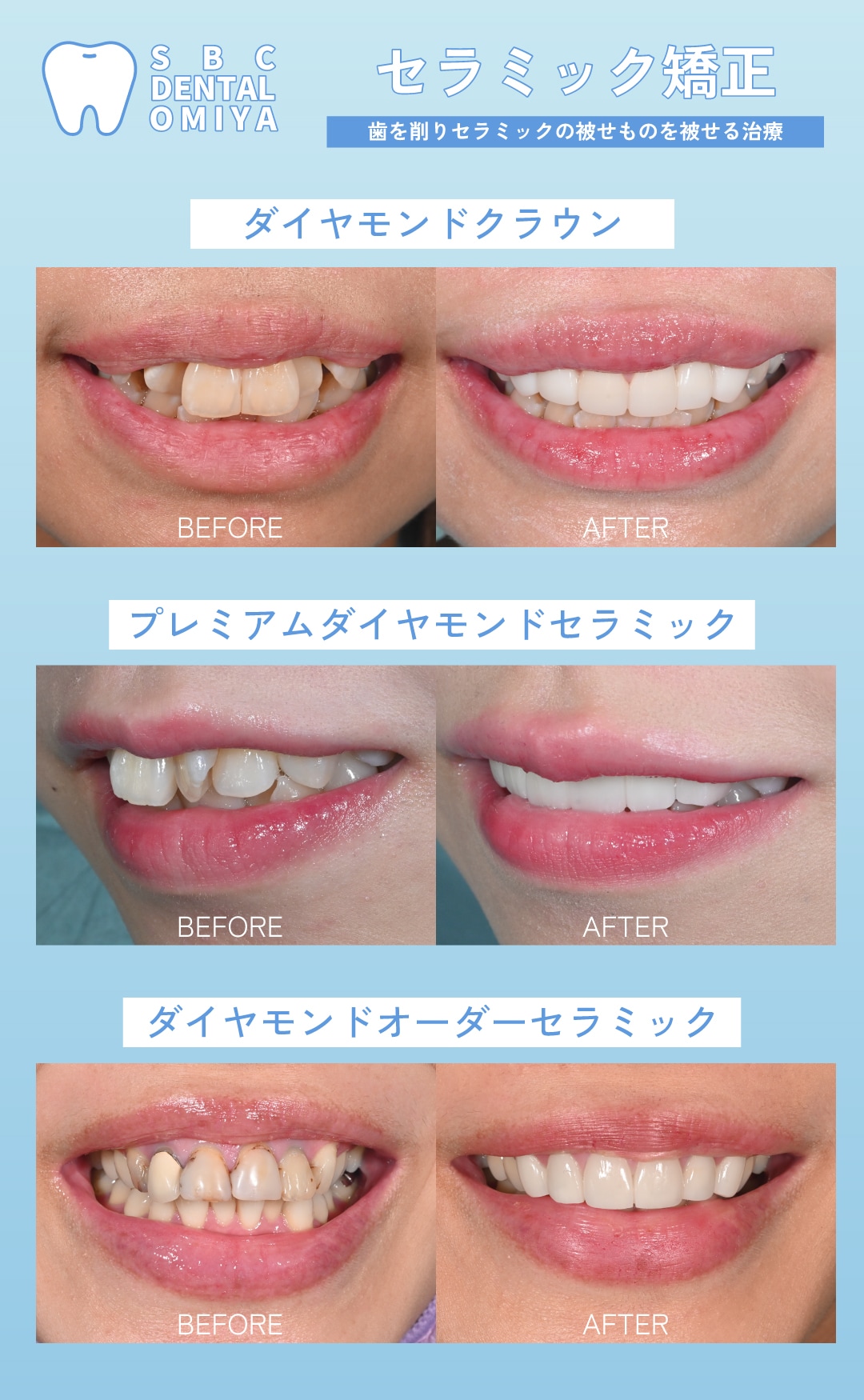 セラミックは変色の心配がなく、耐久性も強いことが特徴です。歯を削り、その上からセラミックの被せものを被せることで美しい歯並びを作ります。