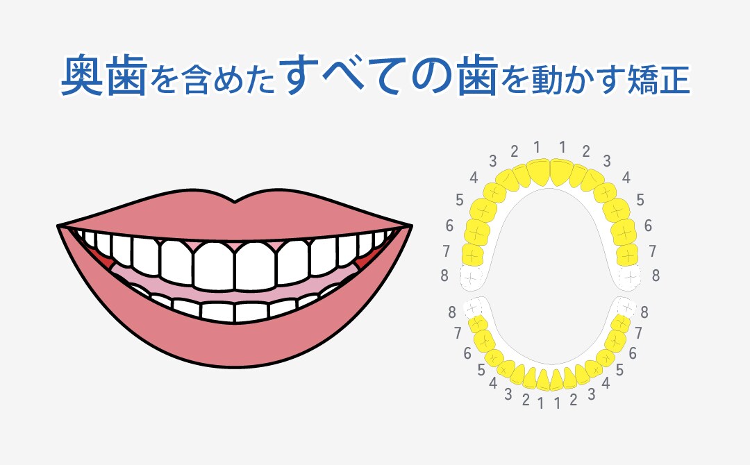 「全体矯正」とは、奥歯を含めたすべての歯を動かし、『見た目の美しさ』と『機能的な噛み合わせ』の両方を根本から改善する治療法です。