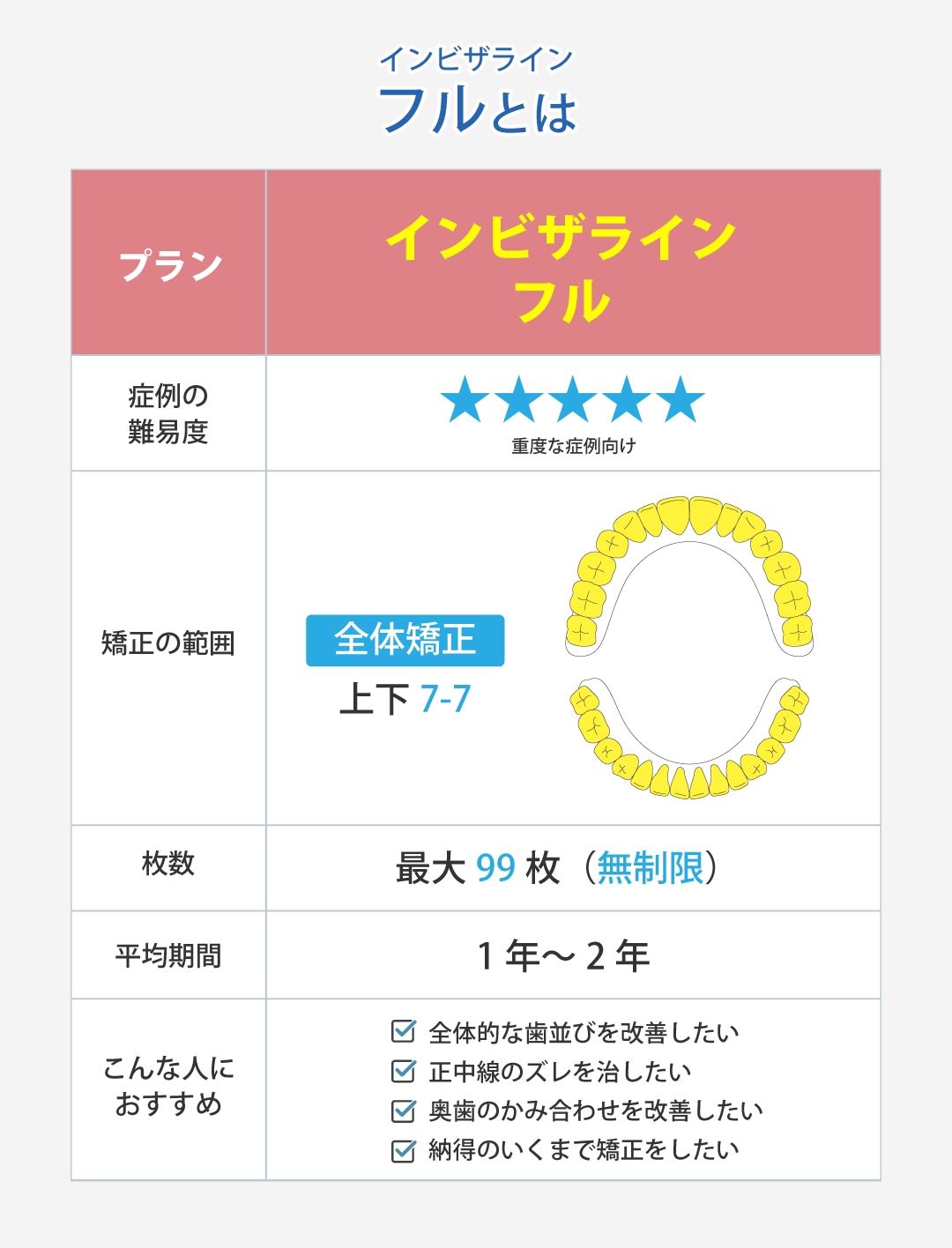 インビザラインフルは、インビザラインのプランの中で最も対応範囲が広く、重度の歯並びの乱れにも対応できるプランです。