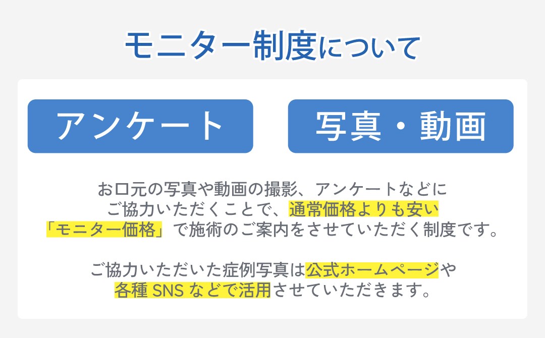 ※モニターには審査基準がございます。お客様のご要望や適用によりモニター施術でのご案内が難しい場合もございます。