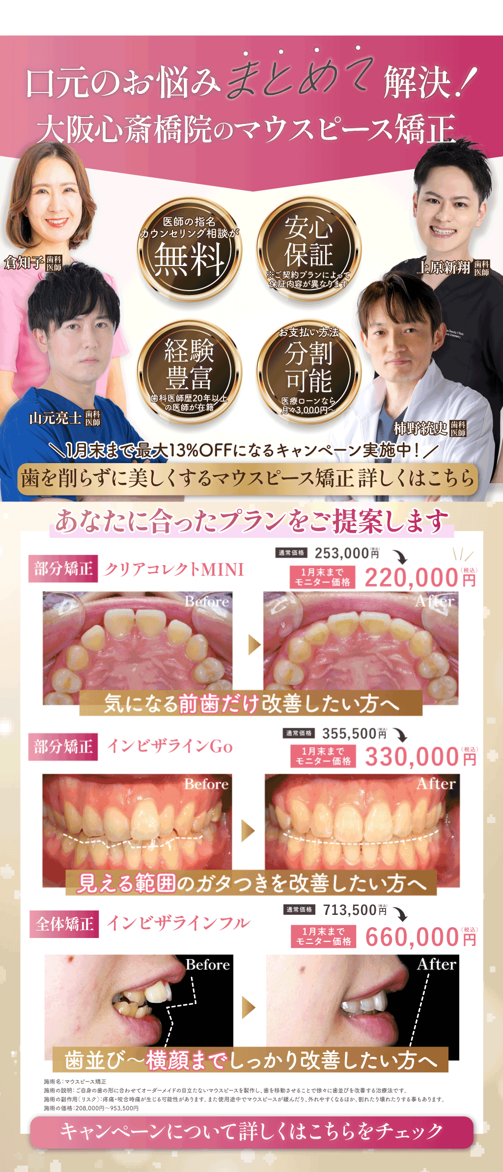 心斎橋院での歯列矯正は保険適用外となっております。大阪心斎橋院では20年以上の経歴を持つ医師を中心に、低価格で高品質な治療をご提供いたします。