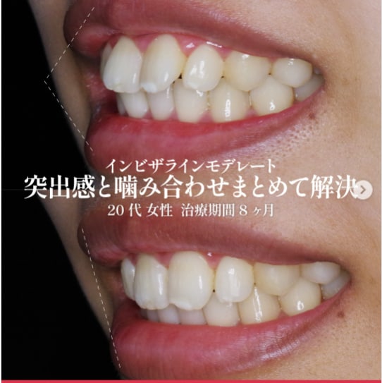 20代女性、インビザラインモデレートの症例です。前歯の突出感と噛み合わせを、わずか8ヶ月でまとめて解決しました。短期間で歯並びが整い、横顔のラインもスッキリと改善。機能美を兼ね備えた仕上がりで、自信あふれる洗練された笑顔へと生まれ変わりました。