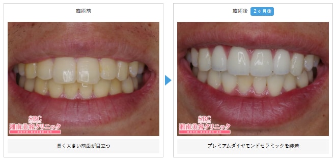 長く大きい前歯が目立つ方の例です。ご自身に合った完全オーダーメイドのプレミアムダイヤモンドセラミックを前歯4本に装着することで、わずか2ヶ月後にサイズが改善し、「出っ歯」感がなくなっています。また、前歯が透明感のある自然な白さになったことで、口元全体の印象も明るくなりました。