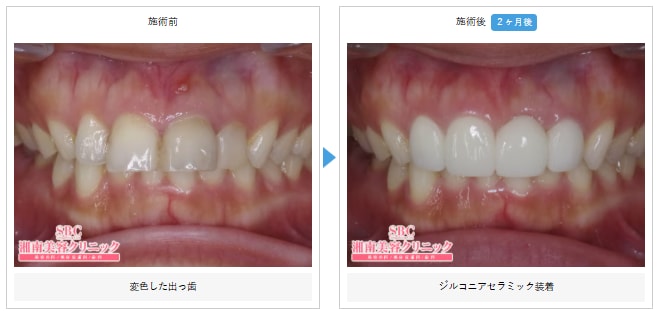 前歯の形と前への傾き、そして色に悩んでいた方の例です。ジルコニアセラミックを装着したことで、2ヶ月後には白く整った前歯になりました。口元の印象も大きく変化しています。