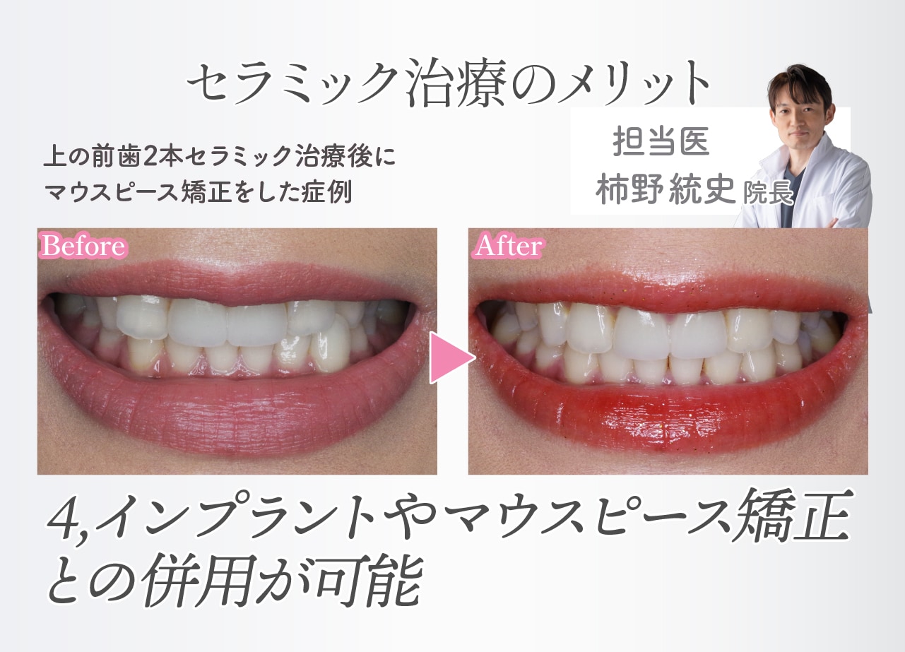 当院はセラミック治療とインプラントやマウスピース矯正との併用も可能です。担当の医師にご相談ください。