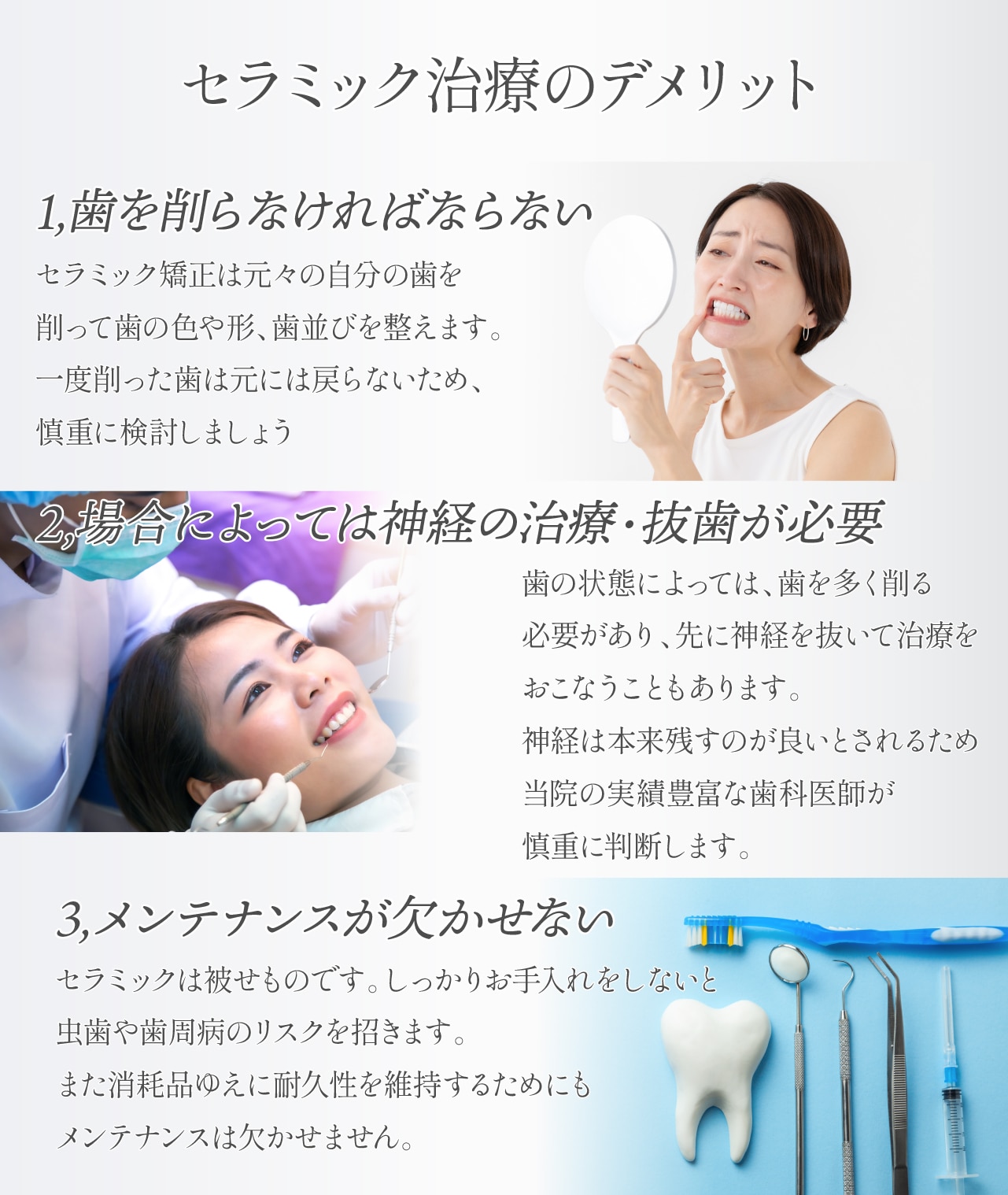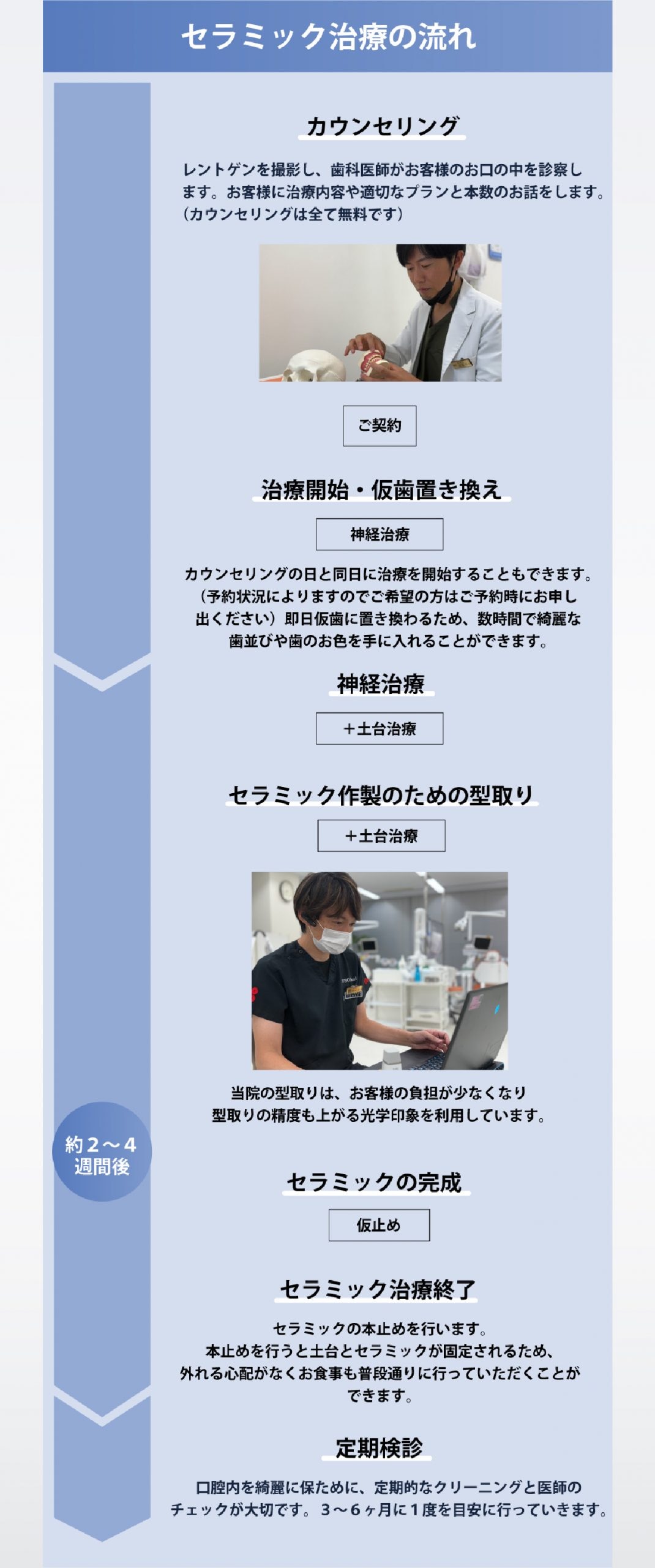 施術の説明:セラミック治療は歯を削ってセラミックの被せ物を被せることで、短期間で歯並びの矯正、歯の色や形、質感の改善ができる治療です。