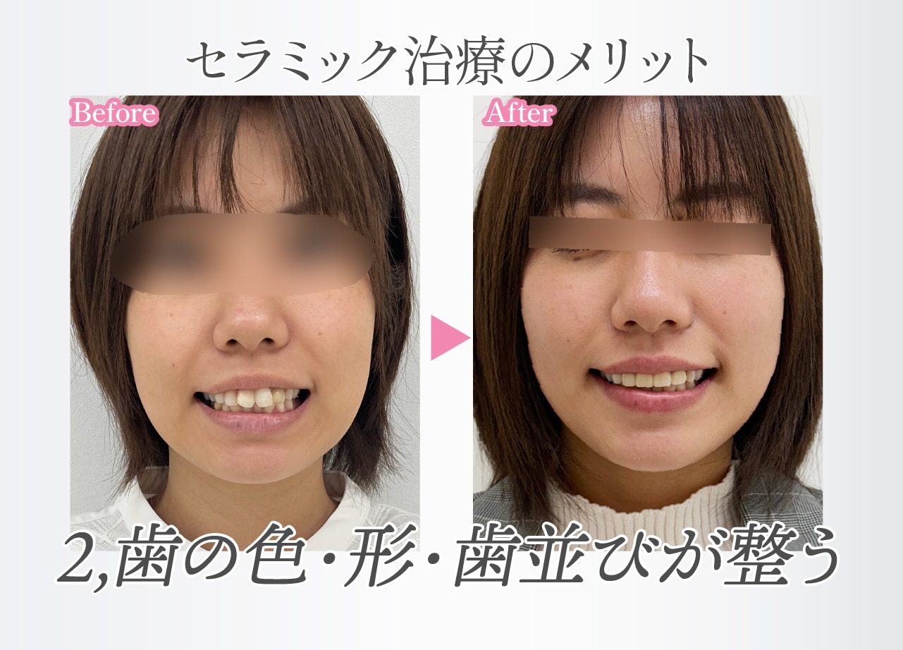 セラミック治療は歯並びだけでなく、色・形・大きさ・角度など一人一人に合わせて整えることができます。