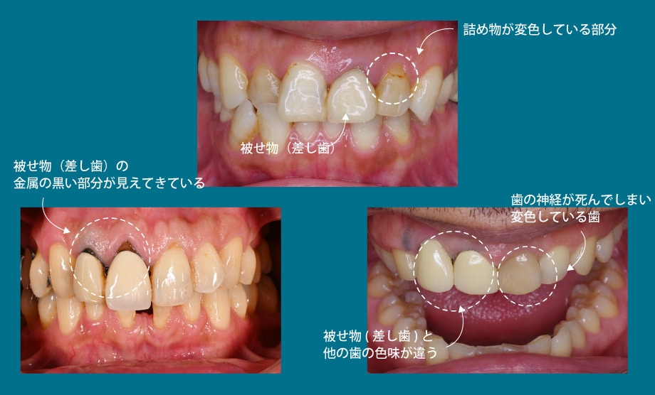 ・天然歯との色の差 治療当初は問題がなくても、年月が経つと天然歯の色は少しずつ変化します。そのため、被せ物や差し歯との色の差が目立ってくることがあります。