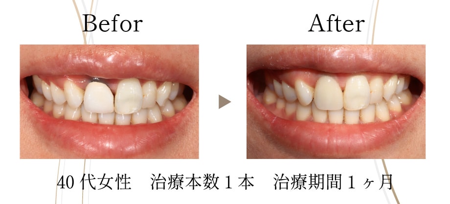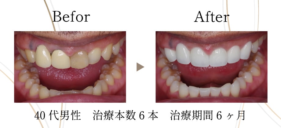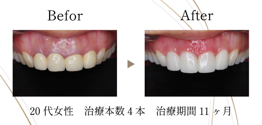 ただやりかえるだけでなく歯の形も一緒に整え、4本のバランスが綺麗に見えるようにセラミックを作成しました。