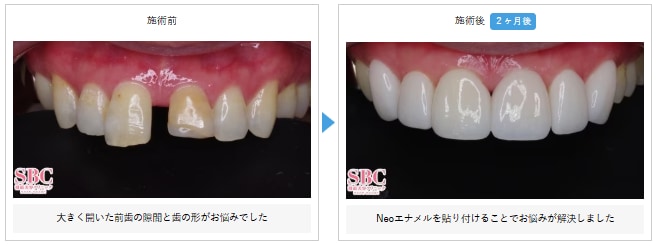 NEOエナメルで表面を少しだけ整え、極薄のセラミックを貼り付けることで、前歯の隙間を改善しつつ透明感のあるナチュラルな仕上がりに!