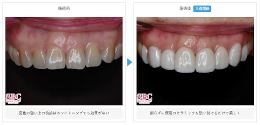 歯の色や表面の小さな欠けを改善する審美目的の場合、歯の表面をわずかに削ってセラミックの薄いシェルを貼り付けるラミネートベニアという選択肢があります。