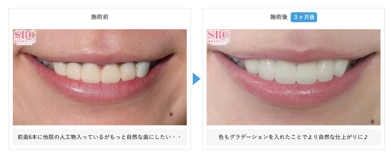 例えば、湘南美容歯科では、以下のような他院治療の修正例があります。
