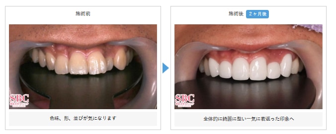 最大のメリットは即効性にあり、短期間で、歯並びだけでなく、歯の色や形、質感までも一気に改善できます。また、矯正装置の装着による痛みや年単位の通院などの負担もありません。