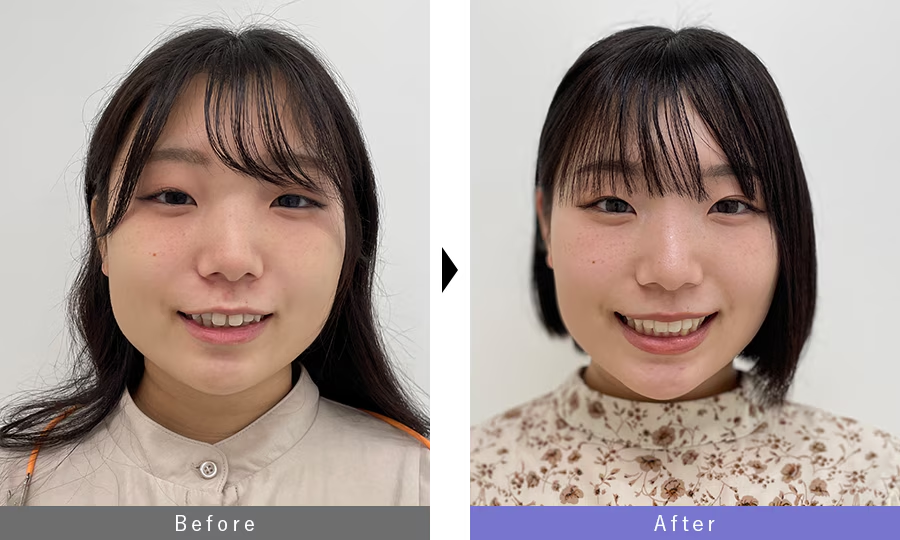 上記は、唇を閉じた際にモコッと盛り上がる「口ゴボ」の矯正治療前後の写真です。14ヵ月の治療期間で、前歯全体の歯列を整えることで口が自然に閉じられるようになり口周りがすっきりとした印象になりました。