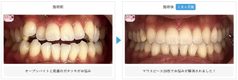 マウスピース矯正は、奥歯を沈めながら前歯を引き出すといった上下方向の動きが得意とされており、開咬の治療との相性が良いといわれています。軽度〜中等度の開咬であれば、マウスピース矯正だけで十分な改善が期待できます。