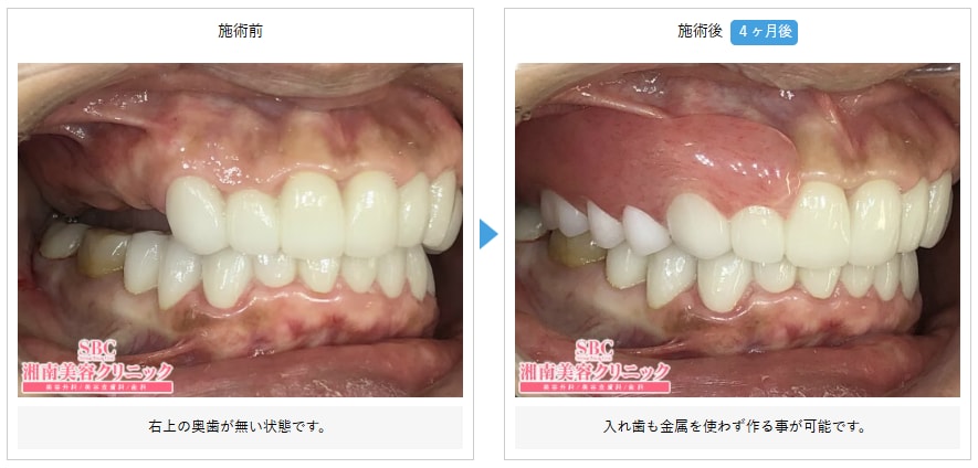 湘南美容歯科では、金属の留め具がない見た目が自然な「美容入れ歯」を取り扱っており、ぱっと見で入れ歯だとわかりにくい自然な口元を目指せます。柔軟性に優れた素材が留め具として使用されているため、従来の保険の入れ歯に比べて痛みが軽減されている点も特長です。