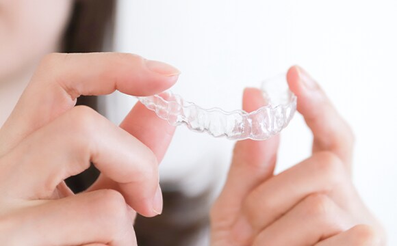 透明に近いマウスピース型矯正装置(アライナー)なので従来のワイヤー矯正に比べて目立ちにくく、気づかれにくいのが特長です。